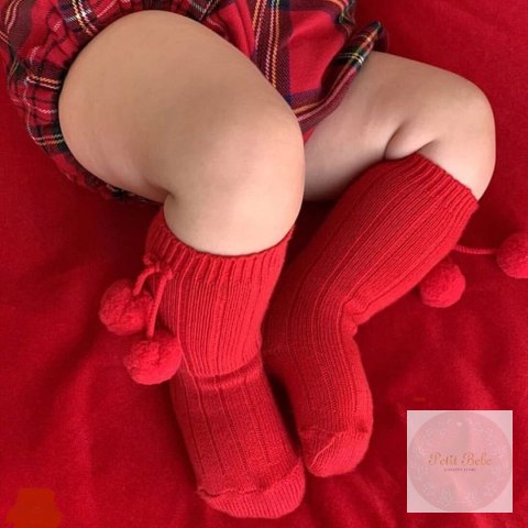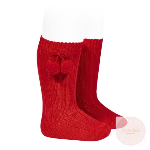 CIEPŁE BAWEŁNIANE PODKOLANÓWKI Z POMPONEM RED #550