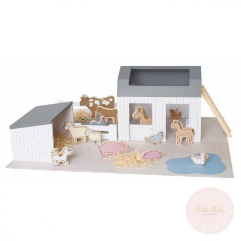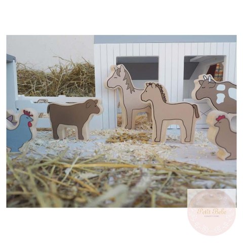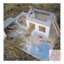 Nasza drewniana zagroda, nie wymaga samodzielnego montażu, jest gotowa do użycia. Podstawa jest wykonana z grubej, twardej tektury a farma wykonana jest z drewna. Składa się z małej stajni z otwieranymi drzwiami przeznaczonej dla koni, oraz większego budynku zagrody przeznaczonej dla pozostałych zwierząt.