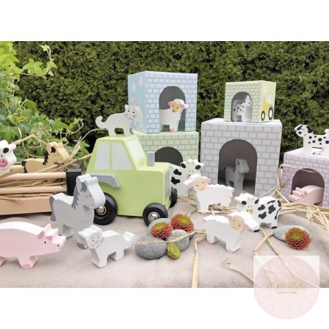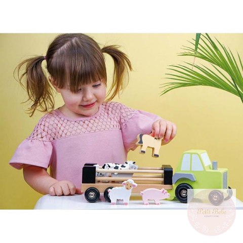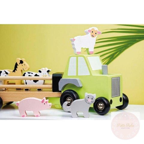 Wspaniała drewniany traktor ze zwierzętami na pokładzie , a wśród nich: koń, krowa, owca, świnia, kot i pies czyli cała gromadka ulubionych przez dzieci zwierząt hodowlanych. Niezbędna w każdym gospodarstwie wiejskim do przewożenia zwierząt i nie tylko. Idealna zarówno dla dziewczynki, jak i chłopca - sprawi wiele radości fanom motoryzacji, jak i wielbicielom zabawy w farmę.  Ta drewniana ciężarówka składa się z auta i przyczepy, którą można odpiąć oraz z sześciu zwierząt. To zabawka idealna do tworzenia niepowtarzalnych historii i przeżywania niezwykłych przygód.  Drewniane zabawki wpływają pozytywnie na wszechstronny rozwój dziecka. Rozwijają kreatywne myślenie. Zestawy ćwiczą małe rączki i pomagają w rozwoju zdolności manualnych. Kontakt z drewnianymi zabawkami daje dużo radości i rozwija poczucie estetyki u dziecka.  Drewniane figurki zwierząt są stojące można je wykorzystywać do samodzielnej zabawy w gospodarstwo wiejskie. Zapakowana w gustowne pudełko idealnie sprawdzi się na prezent, który sprawi wiele frajdy dziecku i rodzicom.  Wiek: 18miesiecy+ Wymiary: 35 x 11 x 8 cm Jabadabado to szwedzka firma istniejąca na rynku od 1993 roku specjalizująca się w projektowaniu i produkcji zabawek drewnianych, elementów wyposażenia pokoi dziecięcych. Wszystkie produkty Jabadabado cechuje oryginalny design, piękna kolorystyka i niezwykle staranne wykonanie. Wszystkie zabawki marki Jabadabado stworzone są z myślą o dzieciach i pobudzają do kreatywnej zabawy.