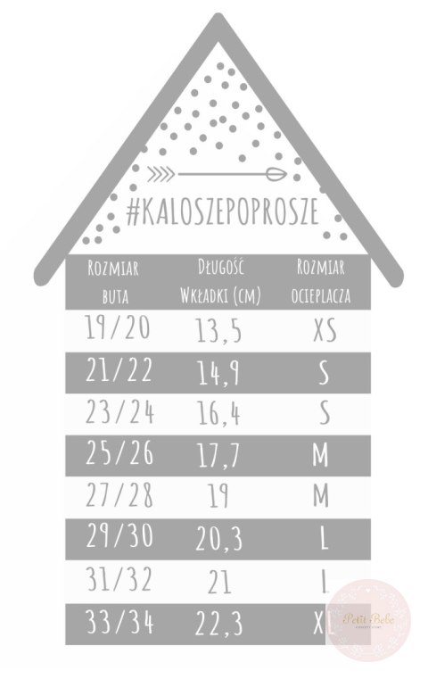Przy doborze kaloszy prosimy kierować się długością wkładki ! Prosimy przed zakupem upewnić się i zmierzyć stópkę dziecka.