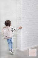 Ma małą kieszonkę z przodu i dużą komorę z małą przegródką w środku i miejscem do zapisania np. imienia dziecka, numeru telefonu.
