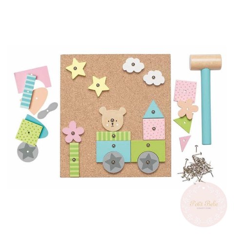 Na korkowej tablicy dziecko może stworzyć wiejskie gospodarstwo za pomoca młotka i bezpiecznych gwoździków. Zabawa rozwija kreatywność, zręczność i koordynację ruchową oraz daje radość tworzenia. Przybijanka MAXI to kreatywna zabawka edukacyjna pozwalająca tworzyć niemal nieskończoną ilość fantazyjnych obrazków, oferująca wspaniałą zabawę oraz idealny sposób na rozwijanie swojej wyobraźni!