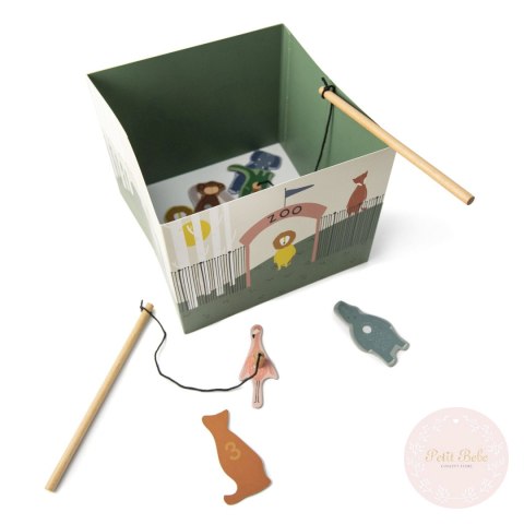 Zabawna gra składająca się z 12 zwierząt, 2 drewnianych wędek i składanego zoo.