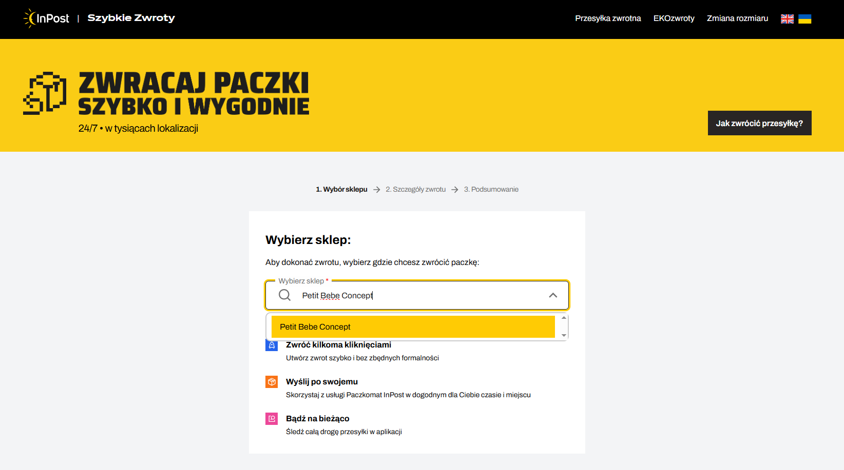 Wejdź na stronę SZYBKIE ZWROTY INPOST i wybierz z listy Petit Bebe Concept.