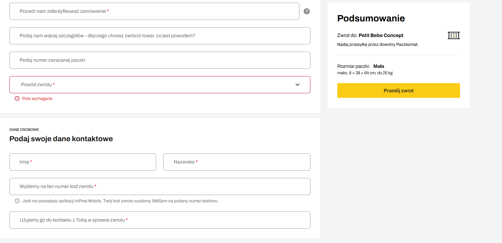 Po wypełnieniu wszystkich obowiązkowych pól kliknij "Prześlij zwrot". Na podany adres e-mail otrzymasz kod zwrotu do wpisania na ekranie paczkomatu InPost.